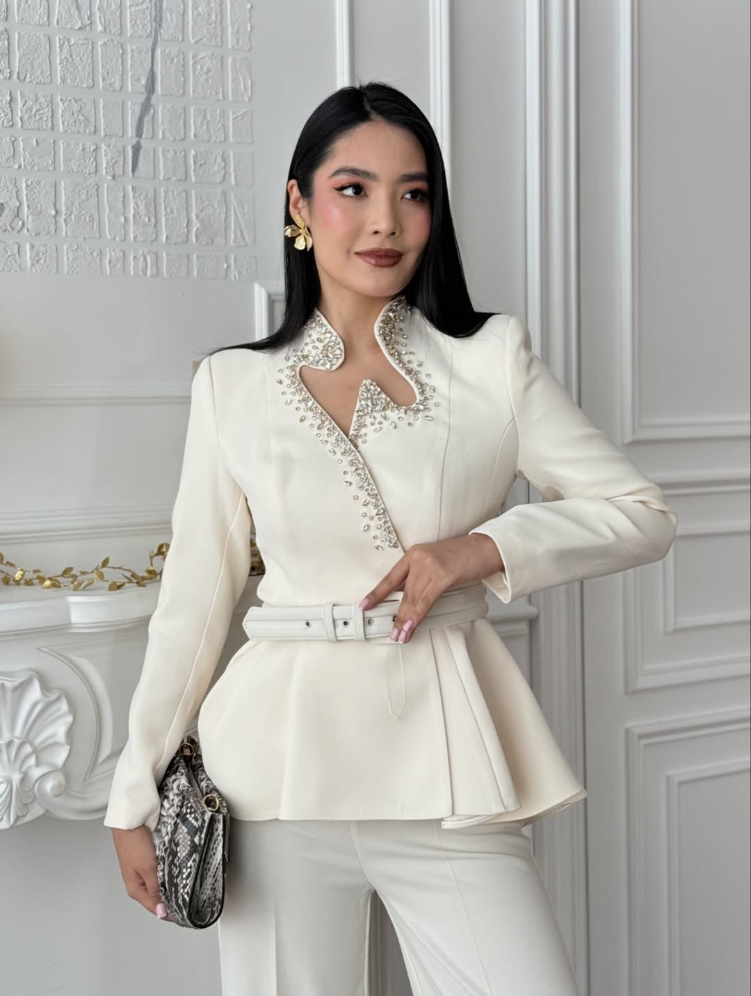 The Ray Jacket is crafted in white banana crepe. This tailored blazer features shaped neckline that creates a modern silhouette, while the fitted shape accentuates the waist for a flattering fit. Embellished with intricate crystal embellishment across the lapel collar of the jacket adds a hint of sparkle and sophistication.